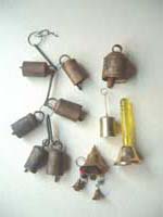 | 鈴各種 右上がべロ?が木製で牧歌的な響きのカウベル 左の6連のものも一応カウベルなのかな 若干喫茶店の入り口のベルの響き |