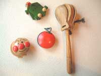 カスタネット関係 右のグリップ付きはフラメンコ用ですかな その他は普通?のカスタネット 赤いやつは幼少の頃より愛用(名前入り) アンパンマンは胴体がスライドホイッスル (その1/人形、吹きものetc篇 参照) その上のはカエル型ですが、特にカエル の鳴き声風なわけでもないがなもし |