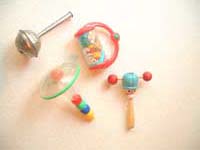 | 赤ちゃん用玩具 ガラガラ系もしくわカタカタ系 左下はガラガラ付きラッパ 右下は鳴りが良く愛用 右上はカランコロン系? 良い音だが音が小さいのであまり使えず |