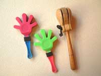 | ハンドクラッパー 右のモノはカスタネットの項参照 左のモノは手形で、カタカタ鳴ります。 手が痛くなったり、痒くなったりせずに 手拍子が出来るという趣向ですな |