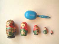 | シェイカー各種 マトリョーシカは小豆を仕込んであります 一番小さい子には中身はないのだが、 入ってるフリしてメンバー5人で振る その上はプラスティック製のマラカス メンバーの誰かが持ち帰り中のため 写真には写ってないが、バナナ等の果物シェイカー も良く使ってますな |